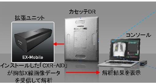 今回発売する「EX-Mobile」は、AI技術を活用して胸部単純X線画像から結節・ 腫瘤影、浸潤影、気胸の候補領域を検出し医師の画像診断を支援する当社のソフトウェア「CXR-AID」の動作環境を提供する小型拡張ユニットだ。本拡張ユニットにインストールした 「CXR-AID」が、カセッテDRから胸部X線画像データを受信し、拡張ユニットに内蔵されたGPU※3で高速処理した解析結果をカセッテDRのコンソール上に即時に提示する。※4