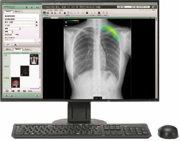 「CXR-AID」は、本年8月に発売したAI技術を活用して胸部単純X線画像から結節・腫瘤影、浸潤影、気胸の3つの画像所見を検出し医師の画像診断を支援するソフトウェアだ。結節・腫瘤影、浸潤影、気胸の候補領域を検出し、それらの異常領域の存在の可能性(確信度)を青から赤までのグラデーションカラーで表示。医師の見落とし防止を支援する。