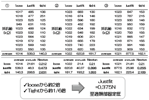 Justfitでの固定圧Nは0.473、0.396、0.255が求められ、justfitはlooseから約2倍、tightから約1/6倍の0.375Nが至適頚部固定圧であった。