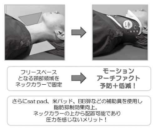 検討Ⅰの結果、固定圧が低すぎると可動域が広まり、固定圧が高すぎると圧迫されすぎる結果になるため至適な固定圧を検証することができた。至適頸部固定圧下において検討ⅡではAのネックカラー(−) 咀嚼(+)が有意差を認められ、Bのネックカラー(−) 咀嚼(−)とCのネックカラー(+) 咀嚼(+)では有意にモーションアーチファクトを低減できた。