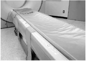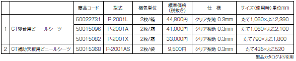 1つ目はCT寝台用ビニールシーツである。当院ではキヤノンメディカルシステムズ社製のCT装置2台が稼働しており、そのどちらの機器にもキヤノン医療用品株式会社が販売する“Cleanpilos” というビニールシーツを使用している(図1)。このビニールシーツは寝台マットに被せ、マジックテープで天板に固定するだけで寝台にフィットするもので、誰でも容易に取り付けることができる。また、サイズは表1に示すように寝台の型式(2,000、1,800、1,500)に応じて3種類用意されており、キヤノンメディカルシステムズ社製のCT装置にカスタマイズされている。サイズが合えば他社のCT装置にも装着可能である。