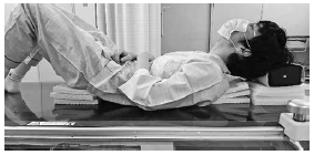 円背の患者が仰臥位になる場合では骨盤と肩が浮いてしまうため、ワンダーボードを数枚重ねて敷くことで、安定した体位を取ることができる。また圧力の分散により患者の苦痛の軽減も見込める(図4)。