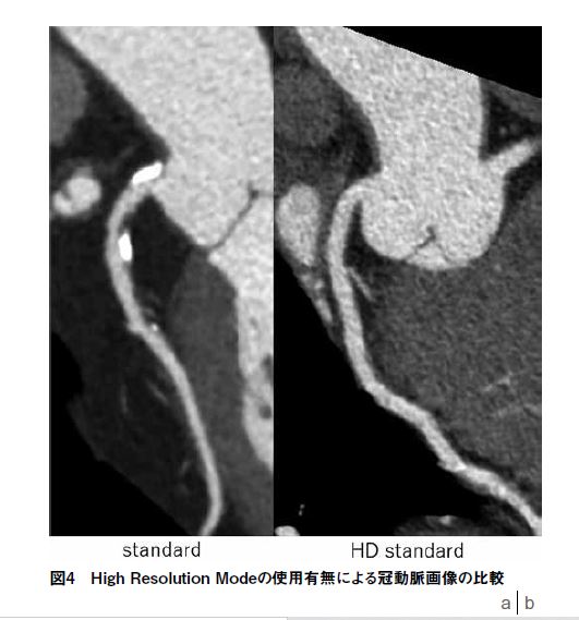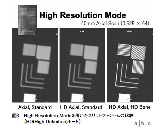 空間分解能について、Revolution CTにはhigh resolutionモードが使用可能で、通常モードが1回転984viewのところhighresolutionモードは2,496viewとなる。この恩恵は面内解像度が上がることはもちろんだが、オフセンターにおける解像度が従来と比較し低下しにくいところにある。ワイヤー法を用いてアイソセンターと20cmオフセンターのMTFを比較した結果、アイソセンターの結果には劣るが、オフセンターにおいてHDモードでは、通常モードと比較してMTFが改善した。これにより、アイソセンターに配置困難なことに加えて、高解像度の画像が必要な整形や心臓領域の撮影に有用である。スリットファントムの画像を図3に示す。通常の撮影モードで通常の軟部関数で再構成したもの(図3a)、HDモードで撮影し通常の軟部関数で再構成したもの(図3b)、HDモードで撮影しHD骨関数で再構成したもの(図3c)を示す。HDモードの分解能が優れていることは明瞭である。では、臨床画像ではどうだろうか。図4に心臓CTのCPR(curved planar reconstruction)画像を示す。HDモードには、通常関数に加えHD関数というさらに高解像度関数が用意されているため、これを用いることで図4bのように軟部関数でも高解像度の画像を提供することが可能となる。このように、心臓CTのような高解像度の必要な軟部領域に非常に有用である⁴)。