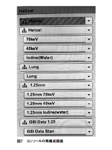 操作者として最も気になるところであろう操作性について記載する。操作性は個人により大きく異なる部分であるので、私個人の意見として読み進めてもらいたい。私のGE社装置に関する使用歴は、Lightspeed VCT、Lightspeed Ultra16、RevolutionCTの3機種である。Lightspeed VCT/Ultra16は同じコンソールでRevolution CTからコンソールが一新された。最も長く使用していたLightspeed VCTはユーザーからの良い評判も多く耳にしており私個人としてもとても使いやすい装置であった。そのため、初めRevolution CTが導入された時はとても戸惑ったことを記憶している。ただ、装置の操作というものは慣れてしまえばさほど苦労はない。そこで、今回はコンソールが変わり良くなったと感じた部分を中心に記載する。まず初めにGSI撮影後の再構成については、dual-energy CTでは様々な再構成画像を作成することが可能である。そのため、1回の再構成キューで1つのパターンしか再構成出来ない従来の方法では非常に効率が悪い。Revolution CTではまず再構成範囲、スライス厚やスライス間隔などの画像の基礎部分を決定し、その基礎部分に従いどの様な画像が必要かを決める。例えば、スライス厚5mmでスライス間隔5mmを基本とし、monochromatic imagingの70・40keV画像、さらにmaterial decompositionにてヨード密度画像を1つのキューで一括再構成(同時再構成)が可能で時間短縮が可能である(図7)。近い将来dual-energy CTが汎用となり多くの再構成が求められたとき、一度に多くの再構成キューを出せるメリットは大きいと思う。これは、実験などデータ収集時においても非常に有用で、実験時は多くの再構成を行うため少しでもそのストレスが減るので私自身も助かっている。