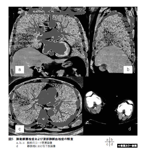 まず、多くの施設が行っている肺動脈塞栓症および深部静脈血栓症の精査について当院の運用を紹介する。造影剤を注入開始後約12秒より肺動脈部に関心領域を置きモニターを始める。造影剤到達後すぐに息止めを行う。なおこの息止めだが、バルサルバ効果により肺動脈の造影効果が下がることを防ぐため安静時息止めを行っている⁵)。造影開始から4分30秒後に下肢静脈の撮影を行う。提出画像について胸部の早期相では、ヨード密度画像を3方向作成しカラー表示にして提供している(図5a、b、c)。GE社ではこのヨード密度画像を“Iodine(Water)” と表現し、ノイズやアーチファクトの少ない画像が提供できる。次に、下肢静脈の評価は造影効果が悪いため、多くの施設で100kVで撮影されている。当院ではGSIを用い40keVの仮想単色X線画像を提供している。このことで造影不良で評価困難となることが少なくなり下肢静脈血栓の評価が容易となる(図5d)。
