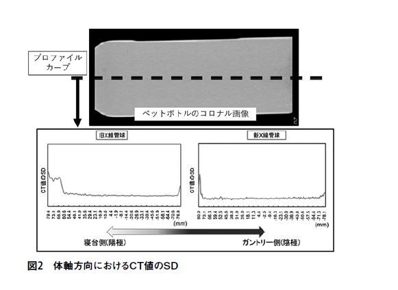 さてここで、wide coverageの撮影で懸念材料である体軸方向におけるヒール効果や散乱線の影響による画質ムラは無視できるのだろうか? これに対し、簡単な実験を行ったので紹介する。120kVで350HUとなるよう調整した希釈造影剤を封入したペットボトルを1回転で撮影し冠状断で再構成した(図2)。画像を見ていただければわかるように、体軸方向に画像ムラが生じていない。これによって、頭部のようなCT値差の小さな領域の画質も良好となる。CT値のSDに対する体軸方向への影響については、辺縁部では線量不足によりノイズが増していたが、最近搭載された新X線管球では辺縁部においても良好な画質を維持している(図2)。