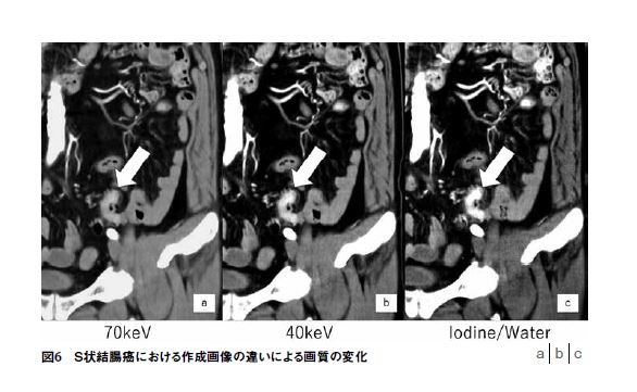 次に、消化管関連のGSI応用を紹介する。症例はS状結腸癌の術前検査で、単純・造影早期相(図6)・平衡相の3相撮影を行っている。撮影法としては、すべての時相をGSIで撮影している。基本的には70keV画像を提供している(図6a)が、必要時には低keV画像(図6b)やヨード密度画像(図6c)も提供している。図6に示すように、通常の70keV画像でややはっきりしない濃染部位も低keV画像やヨード密度画像を作成し合わせて観察することで造影効果を確信することが出来る。これらの画像処理は従来のdual-energy CTでも対応できていた。Revolution CTに代わりどの様なところが改善されたのかを挙げてみる。ヨード密度画像( 図5c)を見てもらいたい。Revolution CT以前の装置で撮影されたヨード密度画像は、ノイズが非常に目立ち体格の良い方などでは画質の劣化があった。この症例は、BMI27とやや体格が大きいがCTDIvolで11.6mGyとDRLs2020における上腹部~骨盤1相でのCTDIvol75%タイル値16.0mGyや中央値12.8mGyよりも少ない線量で撮影している。低線量で撮影しているにもかかわらず、非常にノイズの少ないヨード密度画像を作成することが可能である。すなわち、GSIでありながら120kV時より低線量かつ良好な画質で多角的な視点で症例を観察することが可能ということとなる。これは、GSI撮影を可能とするために使用されているGemstone ガーネットシンチレーターによる検出効率の良さにより、低線量でありながら診断できる画像を提供することができる。例えば、胸部から骨盤までの撮影においてDRLs2020の75%タイル値は16mGyとなっている。当院における連続110例の中央値でGSI撮影では11mGyとなった。これはDRLs2020に記載されている逐次近似応用再構成法利用に限定した線量分布指標の中央値12.2mGyよりも低い値となっている。この低線量撮影に加えmonochromatic imagingにより多彩な仮想単色X線画像が作成可能である。さらに、肺動脈塞栓症の項目でも記載したように物質弁別による密度画像が高画質となったため、高精度な密度値を取得することが出来、定量評価にも今後期待される。このGemstone ガーネットシンチレーターはGSI撮影に特化しているわけではなく、通常撮影も低線量で検査可能である。加えて2019年に発表されたdeep learningを使用した画像再構成である「TrueFidelity™」を併用することで、画質が劣化することなく更なる低線量での撮影が可能である。先ほどの例と同様に胸部から骨盤までの撮影において連続110例の中央値は8.9mGyとなった。