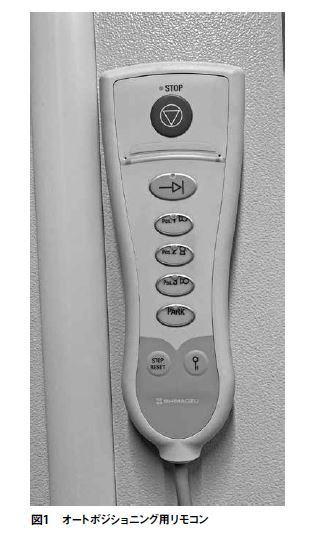 付属のオートポジショニング用リモコン(図1)を操作することで、検査情報に応じて天井走行式X線管懸乗器が自在に移動し、予め決めたポジショニング位置に自動で設定される。オートポジショニング機能によりX線管懸垂器セットアップの手間が省かれ、その分患者のケアに集中することができる。オートポジショニングの設定は各検査情報に応じて登録が可能であり、最大90のポジショニング設定が可能である。オートポジション機能の利用により、検査の効率化という点において検査時間の短縮に繋がり大変重宝している。オートポジション機能はX線管球懸垂器の上下方向や天井走行の水平・垂直方向の動きだけでなく、X線管懸垂器の射入方向の自動調整も可能である。マニュアル設定時には射入方向の角度設定に多少の時間を要していた方も多いと思うが、ちょっとした手間を省くことでポジショニング時の時間短縮に繋がる。また、X線撮影テーブルを使用する際、X線管懸垂器の位置や角度に合わせて撮影テーブル内のブッキー部が自動で長手方向に連動する。そのため、一度に胸椎、腰椎など長手方向に観察部位が長い場合の撮影においても、患者を動かすことなく撮影テーブルとX線管懸垂器の動作だけで撮影が可能である。注意点として、接触防止の安全センサーがない点が挙げられ、検査室内に人や点滴スタンド、椅子等の障害物が存在する場合、オートポジショニング機能を利用する際はX線管懸垂器から目を離さないことは言うまでもない。また、オートポジショニング機能を操作するリモコンは有線のため、リモコンを操作する際は行動範囲が限定されてしまう。患者案内からポジショニングの一連の流れをより効率的に行う上で、リモコンのワイヤレス化に期待をしたい。