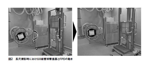 これまで当院で使用していた長尺用Imaging Plate(IP)は83×35.4cmサイズが採用され、長尺撮影領域には限界を感じていた。整形外科による下肢全長撮影や全脊椎撮影などのオーダーは以前から受けていたが、高身長の患者ではIPを斜めに使用するなどの工夫をして撮影を行なっていた。しかしながら、観察対象がIPサイズギリギリの場合、ポジショニングが入念になりすぎてしまい時間を要してしまいうケースがあった。また、Flat Panel Detector(FPD)系と比べIPを使用する際、読み取り機に装填してから画像出力までに時間を要する点や、観察対象がIPギリギリのサイズではポジショニングの難しさも診療放射線技師側の大きな負担となっていた。新たに導入された長尺撮影システムは、撮影時に自動的にX線管懸垂器の首振りを行いつつFPDが上下移動して画像が収集される(図2、3)。長尺専用のIPやFPDが必要なく専用の衝立台を立位撮影スタンドに設置し、ポジショニング後、撮影範囲の設定を行う。撮影範囲の設定は、X線管懸垂器の首振りを動作させ光照射野を撮影対象の上縁と下縁に合わせて設定を行うのみで、簡易的である。2回または3回のばく射後、得られた画像はDigital Radiography(DR)システム側で自動的に結合処理され、X線ばく射後数秒で画像を確認することができる。本システムの導入により、長尺撮影の検査時間は大幅に短縮することができた。本システムはX線管懸垂器の首振りを利用した撮影であるため、撮影距離は150cmと以前利用していた長尺用IP利用時より短い設定となっている。そのため、臥位での長尺撮影範囲も最大120cmまで可能となり、立位・臥位の両方で広範囲の画像を取得することが可能である。一方、FPDを上下移動させて数回の撮影画像を結合することで長尺画像が作成されるため、撮影中の体動と息止めには注意が必要である。撮影スイッチを押してから最後の撮影が終了するまでの時間は2ばく射で約12秒、3ばく射で約18秒程度である。そのため、観察範囲が比較的短く息止めが難しい小児や高齢患者の場合では、従来通り長尺用IPを使用して対応するなどの工夫も必要である。
