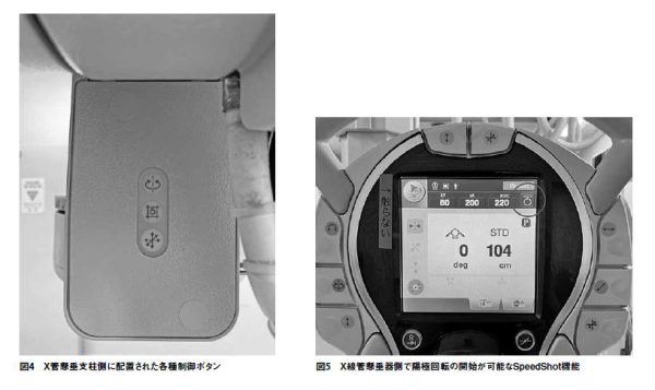 個人的に使いやすい点として挙げるのは、垂直軸回転ボタン、オールフリーボタン、照射野ランプ点滅ボタンがX管球懸垂器の支柱側に配置されている点である(図4)。特に小児の四肢撮影時など、患者抑制と同時にポジショニングと照射野範囲の設定を行う際は大変重宝している。また、X線管懸垂器側でX線管の陽極を回転させるSpeed Shot機能がある(図5)。通常、撮影を行う際はreadyスイッチを押し、ばく射可能となるまで3秒ほどのタイムラグが発生するがポジショニング時に患者の体動や呼吸停止が難しいと判断した場合、X線管懸垂器側でSpeedShotを押すことで、X線管球の回転が始まり瞬時にばく射することができる。ポジショニング時に患者状況に応じて使用することができ、非常に便利な機能である。