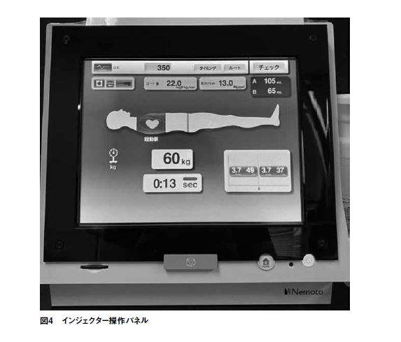 当院では造影検査可能の指標として算出糸球体濾過量(eGFR)値を用いているが、腎機能低下症例では造影剤減量の指示が含まれることがある。ヨード濃度〔mgI/mL〕が異なる造影剤を複数扱っているため、単純に注入量〔mL〕のみを変更するだけでは再現性に乏しく、記録に残す際にも製剤のヨード濃度と注入量を記載する必要があり煩雑になる。Dual Shot GX7では使用する造影剤のヨード濃度と総ヨード量が設定可能であり、医師の指示に応じた減量、例えば20%の減量であれば600mg/kgから480mgI/kgに変更すれば良く、また、適切なシリンジ容量の造影剤準備にも役立つ。
