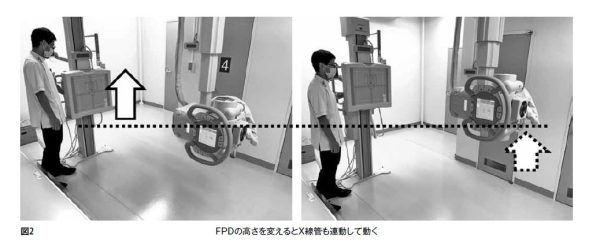 FPDとX線管の自動位置合わせをするオートトラッキング機能により、患者さんの身長に合わせた撮影ポジションを素早く決定することが可能となった。オートトラッキングでX線管の位置を合わせた後、患者さんの身長にFPDの位置を動かすと、自動でX線管がFPDの中心を追従する機能である(図2)。手動にも素早く切り替えられるため、早く動かしたい時などは撮影者側のニーズに合わせた使い方を選択することが可能である。