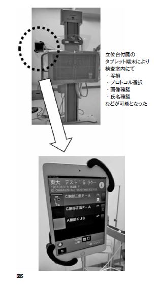 検査室内に操作室コンソール画面とリンクされたタブレット端末があり、画像確認をはじめ様々な撮影変更などが可能となった。発声が困難な患者さんの撮影時でも画面の患者情報表示を見ていただくことで確認が可能となった。また、この画面を操作することで、検査室内でもFPDやX線管などの選択が可能であり、画像確認や写損に至るまでも行う事が可能である(図5)。