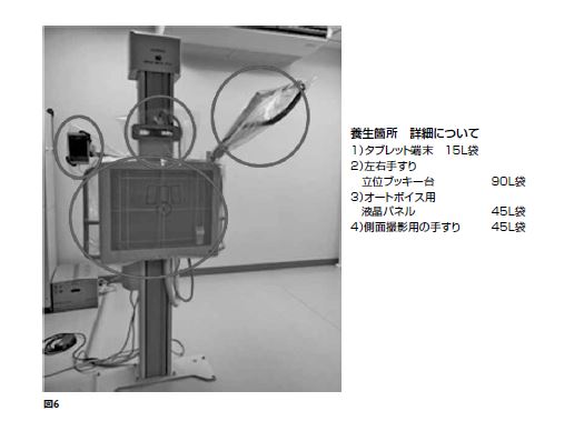 COVID陽性もしくは疑いの患者対応をする際は、当院は2名体制で検査を行い、図6のようなビニール袋で触れる可能性のある部分の養生+PPE+撮影後のアルコール消毒清掃などを行っている。状態が悪く重症度の高い患者さんから、独歩来院する患者さんまで幅広い症状の患者が来院する為、今まで紹介したアシスト機能をうまく使う事で、スピーディーかつ患者さんに合わせた撮影を行う事が可能となり、当院の撮影業務に非常に役立っている。