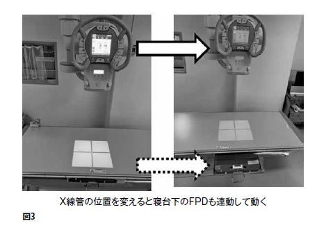 臥位撮影の場合では、X線管を体軸方向へ動かす事で寝台下のFPDが頭側から足側へ自動で追いかけるように動作する為、寝台へ移動後は患者さんをほとんど動かす事無く、ほぼ全身の撮影が可能となった(図3)。今までは寝台の可動域の限界を考慮し、臥位ブッキーでの胸部撮影の際は、ベッドの中央付近に患者さんの胸部が位置するように移動し、股関節を撮る場合は股関節付近がベッドの中央に位置するように移動する等の工夫が必要であった。また、移動後も寝台の可動域が足りなければ患者さんに移動していただくことが必要であったが、ほとんど患者さんを動かす事無く撮影が可能となったため、患者さんへの負担を軽減することが可能となった。