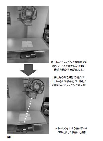 X線管の位置合わせを自動で行うオートポジショニング機能が搭載された。以前はX線管とFPDの中心や撮影距離(SID)を手動で動かし合わせる事が必要であったが、スイッチ一つで任意の設定したFPD中心、SIDへとX線管を移動させることが可能となった。また、デジタル表示にてSIDを表示するため、距離をメジャーで測る動作が不要となった。表示撮影メニューごとに最大30ポイントのポジショニングをプリセットし再現できる為、角度設定が難しい斜入撮影のX線管移動も自動で行うことができる(図1)。