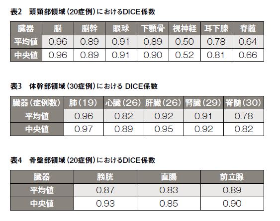 頭頸部、骨盤部領域および体幹部領域について、自動輪郭作成を行なった例を図1~3に示す。また、自動輪郭作成機能を用いて描出した輪郭と、医者により描出された輪郭との一致度(DICE 係数)を表2~4に示す。体幹部領域において、臨床に使用した治療計画に医師による輪郭描出がない場合、もしくは自動輪郭作成が正常に動作しなかった場合(心臓、肝臓で2例ずつ見られた)は評価から除外している。脊髄、直腸、心臓については上縁もしくは下縁の設定に差異があり、視神経は体積が非常に小さくスライス厚などの影響を受けやすいためDICE係数はやや小さい値を示しているものの、その他のリスク臓器については平均値および中央値でおよそ0.8~0.9となっており、高い一致度を示していることがわかる。また直腸に関してはガスが溜まっている場合は自動輪郭の精度はやや悪化するようである。肝臓については体積が大きく輪郭描出にも時間を要するが、自動で輪郭作成ができるような治療計画装置は少ない印象がある。SYNAPSE Radiotherapyは肝臓も良い精度で自動輪郭作成が可能である点は非常に評価が高いと感じる。