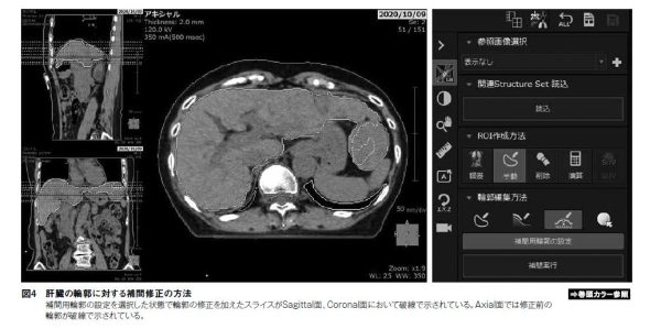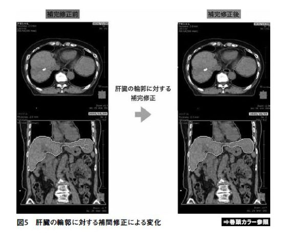 自動輪郭作成には問題点もあり、自動輪郭作成によって生成された臓器輪郭は修正をすることが簡単ではないことが多い。一から手動で輪郭描出を行う際はほとんどの治療計画装置で輪郭の interpolate(補間)ができるため、数スライスおきに輪郭描出を行い補間することで、全スライスでの輪郭作成をすることが可能である。しかし自動輪郭作成で描出された臓器輪郭はすでにすべてのスライス上で輪郭描出がされてしまっているため、修正の際に補間が使用できないことがほとんどである。そのため実際のリスク臓器と作成輪郭にずれが見られた場合、自動作成した輪郭を削除して一から手動で描出する方が早いことも少なくない。SYNAPSE Radiotherapyでは自動で作成した臓器輪郭にも補間を行うことが可能であり、個人的には非常に便利な点であると思っている。「補間用輪郭の設定」を選択した状態でいくつかのスライスにおいて輪郭を修正することで自動作成された輪郭に対しても、修正を加えたスライス間の輪郭を補間することができる。図4、5に自動作成した肝臓の輪郭に対する補間修正の方法及びその変化の一例を示す。