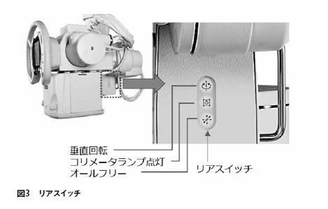 2020年からは手動でⅩ線管球を移動させるときにアシストしてくれる機能:POWER GLIDE™が追加され、力の入りにくい高い位置でのX線管移動も少ない力で済む(表1)。以前から支柱に設置されているリアスイッチはこれらのシステム独自のもので、撮影寝台の反対側に移動せずにⅩ線管球を動かせる秀逸な機能である(図3)。撮影寝台をフットペダルで上方に移動させるときX線管球も自動追尾し、術者の作業しやすい高さでポジショニングが行えるため、腰への負担は軽減される(表1)。
