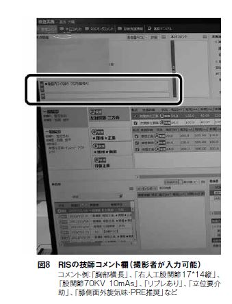 経過観察の撮影が多いため、インプラントの情報や、リブレの装着、体形に合わせた撮影条件など、撮影者が次回の撮影時に気を付ける事項についてRISの技師コメント欄に記載している(図8)。