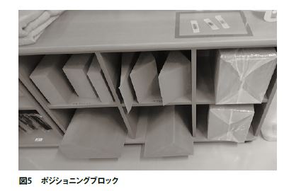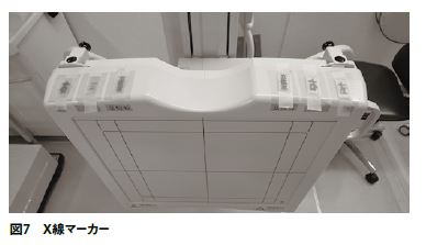 救急や整形外科領域の撮影で必要とされる撮影補助のポジショニングブロック(図5)は、画像に移り込みにくい材質のため重宝している。立位膝関節、立位足関節などのポジショニングには、産官学連携事業で繋がった地元の鉄工所に依頼して作成した立位補助台(図6)を使用している。また、マーカーは規定の位置にセットしておくことで、使いやすさと紛失の低減を図っている(図7)。