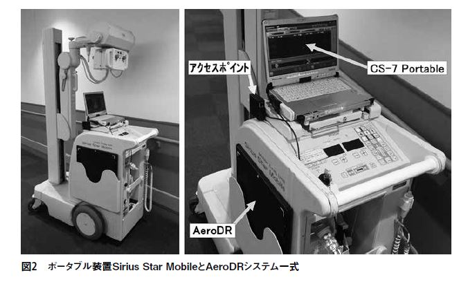 4台のAeroDRのポータブルX線装置は、すべて富士フィルムヘルスケア社のSirius Star Mobileで、制御系内蔵の一体型ではなくセパレートタイプである。システムとしてFPD以外に、コンソールとなるCS-7 Portable、FPDとCS-7 Portableのアクセスポイントから構成され、ポータブルX線装置と受像系が別々のシステムであるため、装置に依存することなく自由に組み合わせが可能、メンテナンス性が良いなどのメリットが存在する(図2)。