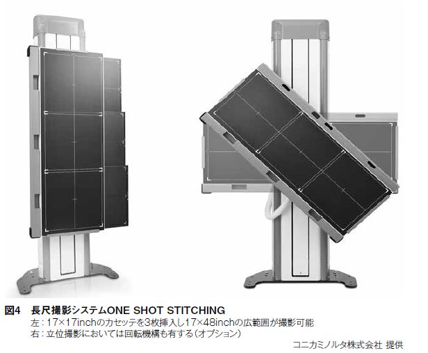 残る長尺撮影に関しては、2022年3月にAeroDRを用いたワンショット長尺撮影システム(図4)を導入予定である。このシステムでは、17×17inchのFPDを3枚使用し、最大で17×48inchの撮影が可能であり、特長として、一回曝射での撮影、立位撮影では受像部の回転機構を搭載(オプション)、パネルフォルダを取り外すことが可能で立位・臥位両方の撮影にも対応、などが挙げられる。当院で特に重視した点は一回曝射であり、自立保持が困難な患者の撮影に際しては体動の面で非常に有利となる。また、極端にアライメントの悪い患者の全脊椎側面撮影では、従来は長尺カセッテを技師が斜めに保持する形で撮影を行なっていたが、今後は立位撮影での回転機構が活躍すると考えている。なお、長尺撮影に使用するFPDは長尺撮影システム専用ではなく、立位・臥位撮影用やカセッテ撮影用のFPDと兼用可能であり、バックアップとしても使用できることから、FPD枚数の最適化を図ることができる。