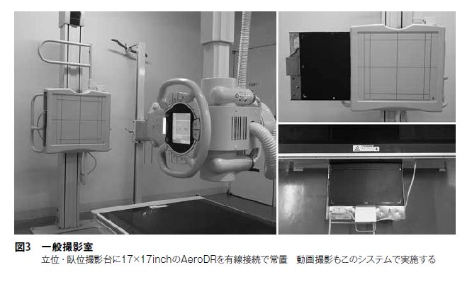 当院では一般撮影室が5室あり、そのうち2室でAeroDRを採用し全面FPD化を図っている。立位・臥位撮影台に17×17inchのAeroDRを有線接続で常置し、可搬型として14×17inchと10×12inchを一室に、10×12inchを一室に配置している。なお、立位・臥位撮影台に常置している17×17inch もホルダーから外してワイヤレスタイプとして利用可能であり、X線発生装置はいずれも島津製作所のRAD speed Proである(図3)。残る3つの撮影室では、据置型FPDとCRを組み合わせた運用を行なっているが、今後数年以内にAeroDRへの更新を計画しており、同一規格に統一することによる高い互換性とシステムのスリム化を目指している。
