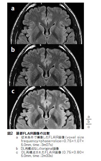 AIR™ Recon DLは現在2Dのみの対応ではあるが、spin echo(SE)系、gradient echo(GRE)系、diffusion weighted image(DWI)、FIESTA、single-shot fast spin echo(SSFSE)の幅広いコントラスト・撮像法に対応している。当院の運用として、AIRTM ReconDLによってSNRに余裕が生まれるため、最短echo spaceになるよう受信バンド幅を調整しつつ、収集ボクセルサイズを検査全体で平均約35%向上させた。さらにAIR™ Recon DL自体にも鮮鋭度を向上させる効果(従来再構成よりも約30%鮮鋭度が向上)があるため、視覚的インパクトは想像以上である(図3)。体動やフローアーチファクトの影響無ければ、加算回数(NEX)を積極的に減らすことができるため、撮像時間の短縮に繋がる。急に画質が良くなりすぎると逆に違和感を持つ人もいるかもしれないが、AIR™ Recon DLはdenoisinglevelを3段階調整可能なため、適度にノイズがのった鮮鋭度の高い画像を得ることもできる。