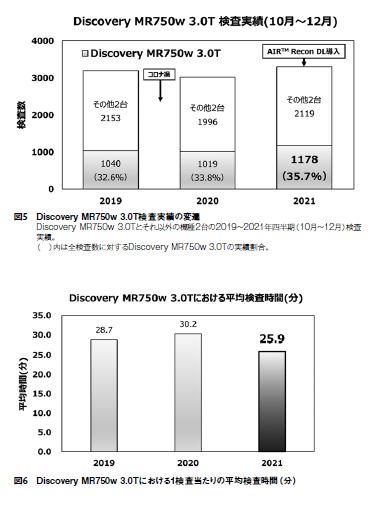 AIR™ Recon DLが実装されているDiscoveryMR750w 3.0Tの直近数年間の10月~12月期の検査実績を図5に示す。コロナ禍によって外来患者の受診控えや入院患者の制限により、2020年は前年に比較して約5%の検査実績減少となった。AIR™ Recon DLが導入された2021年は新型コロナウィルスへの警戒感の緩和もあるが、大幅な検査実績の増加となった。図5の( )内は全検査数に対するDiscovery MR750w3.0Tにおける検査実績の割合であるが、2019、2020年に比較して2021年は2~3%検査数が増加している。また、図6のDiscovery MR750w3.0Tにおける1検査当たりの平均検査時間では例年は28分~30分を要していたのに対し、2021年は平均約26分に短縮されている。以上のように検査ワークフローの改善により当該機種の一日当たりの検査数が増え、予約枠圧迫の改善や時間外業務の減少などの病院経営への貢献にも役立っている。