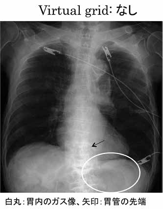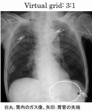 b 胃管の位置を調整し、撮影依頼がきた。gridなしで撮影し、virtual grid を3:1に設定し、肺野の見える通常の画像処理でも胃管の位置が確認できた。