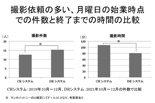 そこで両者の撮影件数とそれに要する撮影時間の比較を行った。病棟患者さんのX線ポータブル撮影の依頼の多い月曜日の朝にRISにオーダーされた患者さんの撮影件数とその撮影が完了するまでの時間を調べた。対象期間は、CRシステムは、2019年10月から12月の月曜日で、DRシステムは、2021年10月から12月の月曜日のそれぞれ3ヶ月間とした。比較した項目は、8時30分時点のX線ポータブル撮影の依頼件数と撮影が実施完了までの時間をRISと画像の実施時刻から調べた。その結果は、CRシステムは、平均12.6±3.0件で、検査終了まで平均107.4±25.1分であった。