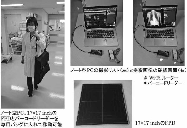 このノート型PCを用いることで、X線ポータブル撮影をワイヤレスFPDで撮影した画像は、Wi-Fiを介して通信可能である。ノート型PCが14inchサイズと画面が小さいことやX線を曝射する際の操作が違う点以外は、DRシステム搭載のX線ポータブル装置と同様の撮影、画像処理と転送が行える。また、専用バッグに、ノート型PC、17×17inchのFPDとバーコードリーダーを入れて移動でき、感染エリアや手術室にある古いX線ポータブル装置もDRシステムとして使用可能と