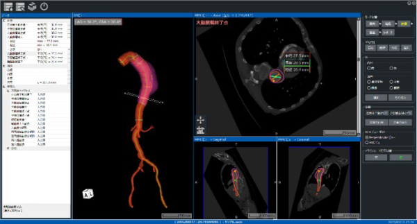 ステントグラフト内挿術では、足の付け根を数センチ切開し、動脈からカテーテルでステントグラフト(金属のバネが骨組みになっている人工血管)を大動脈瘤の位置まで運び大動脈瘤を内側から塞ぐ。この大動脈瘤での適切な処置を正確に行うため、術前計画では造影CT撮影と3次元的な計測・分析が行われている。