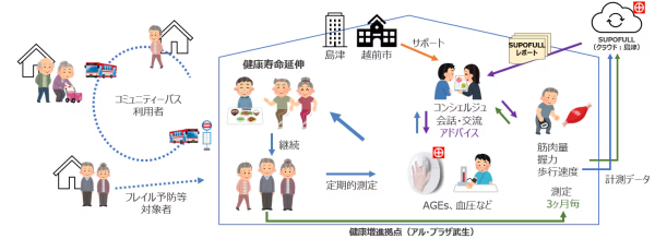 島津製作所と越前市は、スーパーマーケットを展開する株式会社平和堂(本社:滋賀県彦根市)の協力のもと、市民の健康意識向上に努める。同社が運営する市内の商業施設「アル・プラザ武生」を健康増進活動の拠点として、「AGEsセンサ」の設置や定期的な健康イベントを開催する。同施設に置かれている血圧計や筋肉量計および「AGEsセンサ」などの測定結果をもとに個人に合わせたアドバイスを「SUPOFULL」より提供し、平和堂の店舗に常駐するコンシェルジュなど支援者とともに、利用者の健康増進に寄与する。