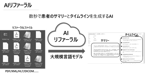 「AI Referral」は、DICOM画像およびテキストレポートを並列に解析し、患者概要とドキュメントタイムラインを自動生成するツールだ。医師による症例の理解と意思決定を迅速かつ的確にサポート。さらに、モバイル対応のクラウド環境上で動作するため、医療現場におけるリアルタイムな連携と業務効率化にも寄与する。従来の医療連携システム「DOCloud」と連携させることで、モバイル端末からの記録共有・確認がスムーズに行えるようになり、健康診断や遠隔読影においても柔軟な対応が可能だ。