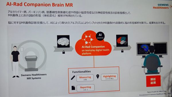 AIを搭載したクラウドベースの拡張型ワークフローソリューションであるAI-Rad Companionは、基本的なルーティン作業の負担を軽減し、読影における診断精度を向上させる。 AIを搭載したアルゴリズムにより、画像データセットのポストプロセッシングを行い、反復的なタスクや症例数の多いルーティン業務を自動化することで、日々の業務の負担を軽減する。