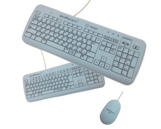 柔軟性のあるシリコン素材を使用し、アルコールやエタノール等の液体タイプの除菌剤に対応した防塵・防水仕様(IP65)の キーボードとマウス。キーボードは、キー無効化機能によりPCに接続したままでの清掃・消毒作業ができ、さらにフルフラットデザインのため拭き残しも軽減できる。また、キーボードには光と音で清掃を促す清掃アラーム機能搭載モデルも用意。共有端末での院内感染対策に貢献する。