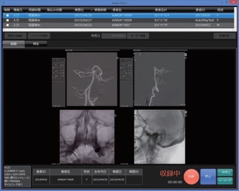 『Kada-Rec』はX線診断装置の透視像を取り込み、画像ファイルとして保存する透視像録画/配信システムである。最大解像度1920x1080pixelの映像信号を最大4系統同時に取り込み、MPEG4 (H.264)形式の汎用的なフォーマットの動画ファイルとして保存できる。WindowsやMacなどさまざまな環境で映像閲覧・編集作業が容易に行える。『Kada-OR』 とも連携し検査オーダー、収録操作をコントロールし管理できる。