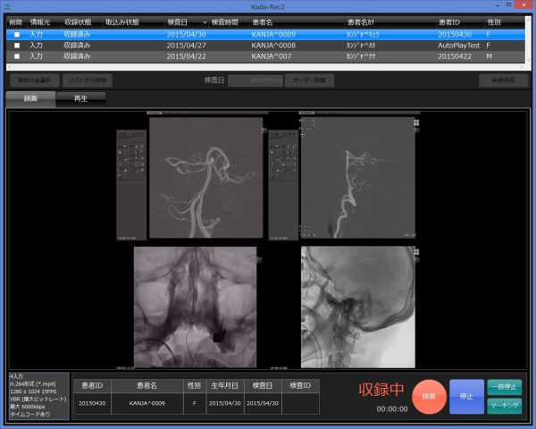 「Kada-Rec」はX線診断装置の透視像を取り込み、画像ファイルとして保存する透視像録画/配信システムである。最大解像度1920×1080 pixelの映像信号を最大4系統同時に取り込み、MPEG4(H.264)形式の汎用的なフォーマットの動画ファイルとして保存できる。WindowsやMacなどさまざまな環境で映像閲覧・編集作業が容易に行える。「Kada-OR」とも連携し検査オーダー、収録操作をコントロールし管理できる。