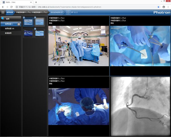 透視を中断した直後に自動再生されるほか、サムネイルを選択することで、連動した動画を最大4画面まで同時に再生することができる。また、血管造影X線診断装置と接続する際、X線曝射と連動することで撮影、透視中の映像のみを収録することが可能となっている。撮影、透視像だけを保存するため、収録映像のファイル容量を最小限に抑えられるだけでなく、効率的に検索もできるのが特徴だ。収録した情報はDICOM MWMで取得することができ、検査情報が付加されるため、映像の管理も容易となる。さらにDICOMサーバーにてカテ室で発生する様々な映像を収録・配信するシステムであるKada-ORと連携させることで、検査オーダーや収録操作をコントロールして管理できる。