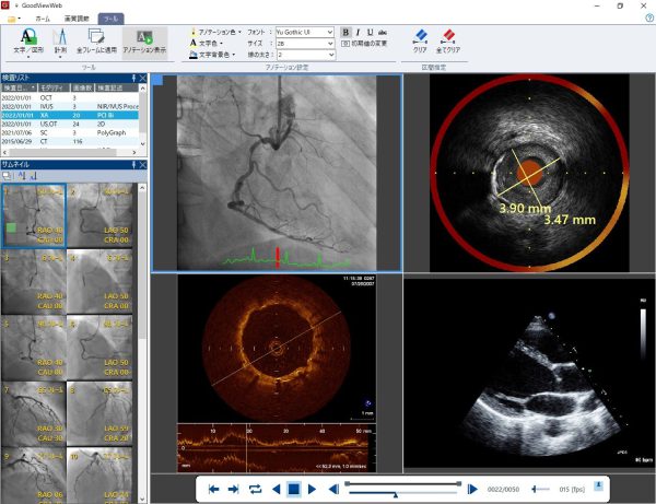 DICOMビューワとして医療画像活用の幅を広げてきたGoodViewに、より高度なエコー画像の計測機能が追加され、さらに使いやすくなる。追加された機能により心臓のボリュームの測定が簡単にできるようになり、収縮期と拡張期のボリュームの計測により循環器系の評価には重要で、専用機種やソフトではないと難しかった左室駆出率の算出も簡便に迅速に可能となる。これまで高位システムであるTomTec-Arenaでしか行えなかった高度な解析が一部GoodViewでも可能となり、より多くの医療現場での活用と迅速な診断につながることが期待される。本機能は2022年4月に認証を受け、同年夏ごろからバージョンアップが可能となる予定。