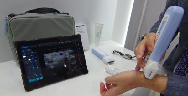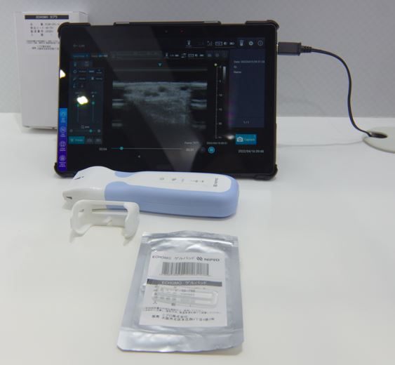 モバイル超音波画像診断装置ECHOMOに心強いアクセサリーが登場した。これまでカテーテル治療の穿刺時に特化した超音波プローブとして頸動脈や大腿動脈に使用されてきたが、専用ゲルパッドの活用で血管までの距離が近い橈骨動脈でも使いやすくなった。橈骨動脈描出用に厚みを設計されたゲルパッドをホルダに入れて計測することで、橈骨動脈の描出が容易になった。ECHOMOはタブレットをあらかじめ立ち上げておけば約15秒で起動されるという早さで迅速な穿刺と手技をサポートしており、ゲルパッドの登場でより応用範囲が広がることが期待される。ゲルパッドは5枚一組で20,000円。