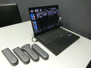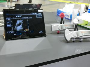 スマートフォンや車のLSIの設計開発を実施している企業、株式会社ソシオネクストがメディカル市場向けに開発したもので、超小型、超軽量化、ワイヤレスが特長の超音波診断装置。高繊細の画像撮影が可能でワイヤレスかつバッテリー持ちが3時間なので安心して持ち歩いて使えることが特筆すべき点だ。