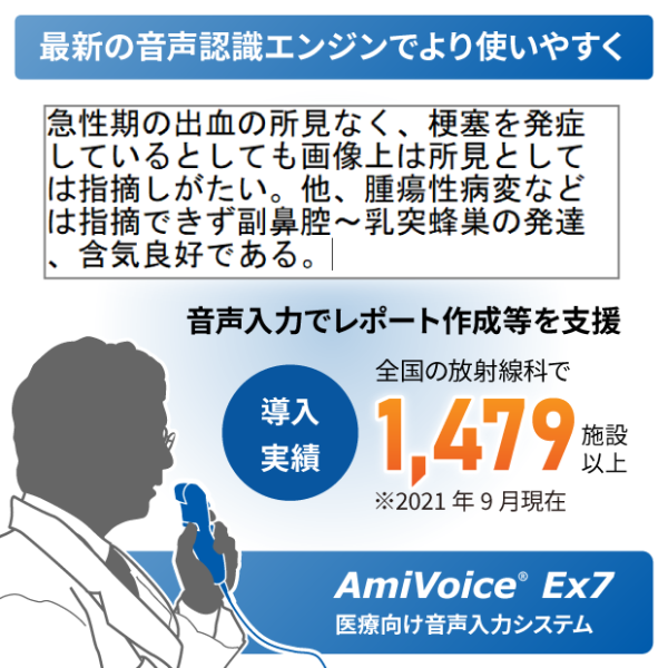 「AmiVoice® Ex7 Rad」は、画像診断レポートの作成時間を約半分に短縮する等、入力業務の効率向上に貢献し、現在では約1,479施設(2021年9月時点)の医療機関にて活用頂いている放射線科向け音声入力システムである。