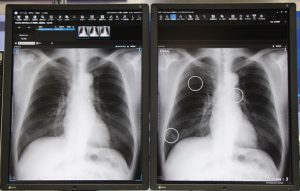 専門家医のスキルをディープラーニングで事前学習したAIが胸部X線画像を解析する、胸部に特化した画像診断支援AIソフトウエア。医師による読影に際し、結節影や浸潤影、腫瘤影など、肺癌や肺炎、結核などに繋がる所見を検出するソフトウエア。読影時にAI解析結果を確認することで、見落とし防止が図れるだけでなく、撮影後、医師の読影結果とAI解析結果を突き合わせることで、確信度の向上にもつながる。