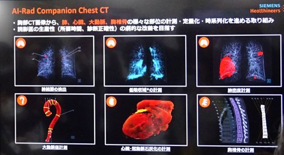 「ChestCT」は肺結節検出、肺実質の計測・表示、心臓容積、冠動脈カルシウム計測、大動脈計測、胸椎骨計測、Pulmonary Density(肺密度計測)など、胸部CT画像AI解析受託サービスを提供する。同製品について、西井達矢氏(国立循環器病研究センター 放射線部医長)は「肺や各肺葉だけでなく、異常陰影のセグメンテーション精度が高い。肺炎のCT画像に対するこれまでの定性評価から、精緻な定量評価を行いたいという気持ちになる。提供されるVR画像も主治医や患者にとってわかりやすく、『伝わる』レポートにつながる可能性を感じる」と評価する。
