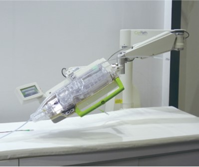 CorPath GRXシステムは、遠隔のコックピットからガイドワイヤやカテーテルの操作や保持などを行うインターベンションサポートロボットである。