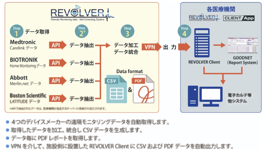 『REVOLVER』は異なるメーカーの遠隔モニタリング情報を自動取得、加工して可能な限り統一化し、CSV・PDFファイルとして各医療機関に自動出力することで、メーカーの枠を超えた情報の一元管理を実現する。これによって、逐一各社の遠隔モニタリングウェブサイトへとアクセスし、人力にて閲覧・確認・取り込み・転記など、多くの工程をもって情報を統合していた作業を自動化。作業量・人件費の削減や、ヒューマンエラーの抑制などのソリューションを生み出す。