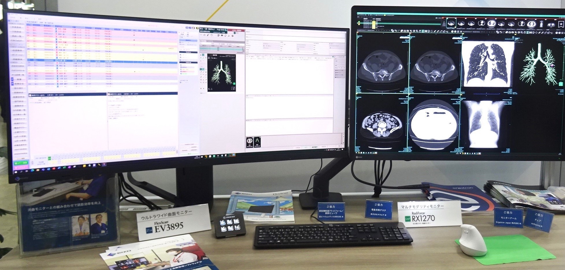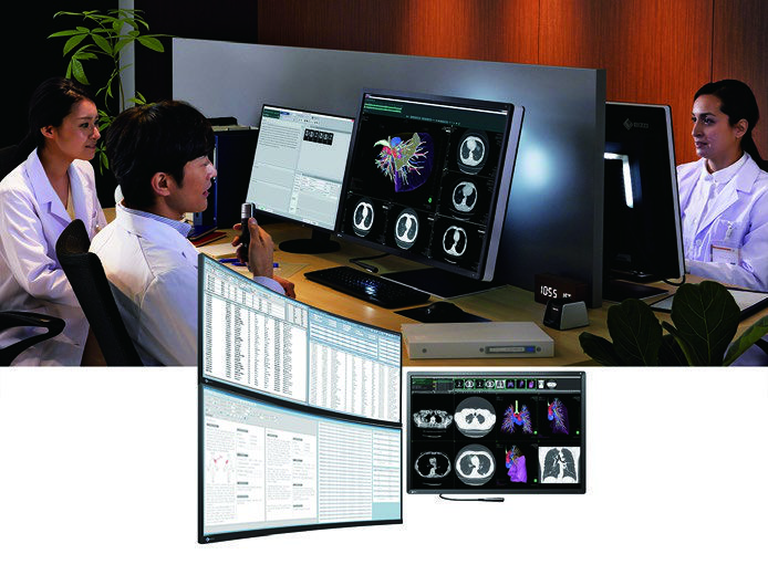 『EV3895』は、フルHDモニター三台分の3,800×1,600ピクセルの解像度ながら、湾曲したモニターであることで、電子カルテや読影リスト、読影レポートなどテキスト情報を表示する際の一覧性に優れ、かつ設置スペースを削減できる。